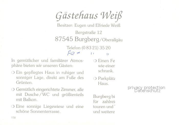 73738263 Burgberg Allgaeu Gaestehaus Weiss postalisch nicht gelaufen Werbekarte (keine Postkarte) Erhaltung siehe scans [FriedD77] KatCode: 11110009780118