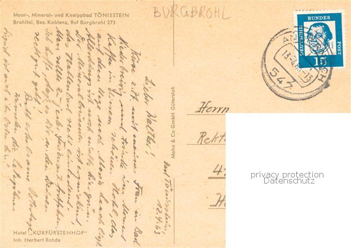 73813975 alte Postkarte Burgbrohl Kneippbad Toenisstein im Brohltal postalisch gelaufen Erhaltung siehe scans [FriedD77] KatCode: 11110007131202