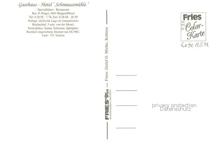 73652094 Burgen Mosel Gasthaus Hotel Schmausemuehle Restaurant Terrasse postalisch nicht gelaufen Erhaltung siehe scans [FriedD77] KatCode: 11110007137206