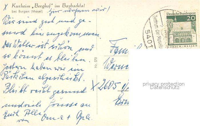 73663156 alte Postkarte Burgen Mosel Kurheim Berghof im Baybachtal postalisch gelaufen Erhaltung siehe scans [WerneD78] KatCode: 11110007137206