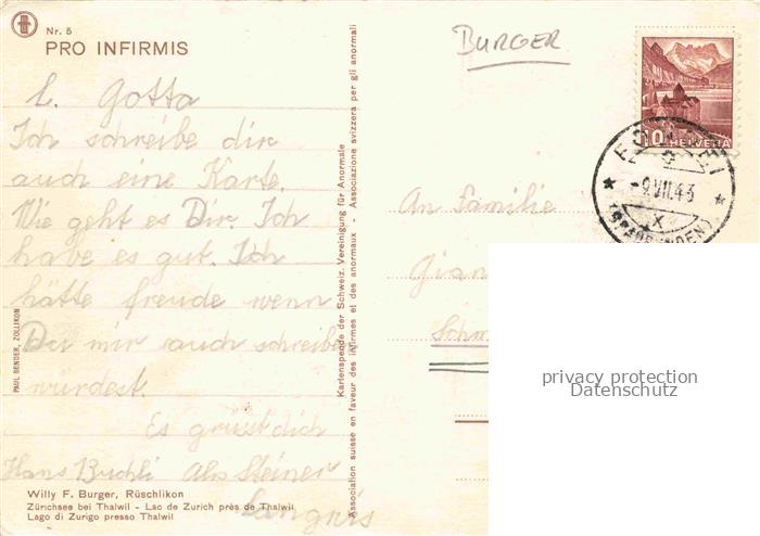 74012017 alte Postkarte Burger Willy F. Kuenstlerkarte RueschlikonZuerichsee bei Thalwil postalisch gelaufen Erhaltung siehe scans [IrynaD87] KatCode: 22240000003200