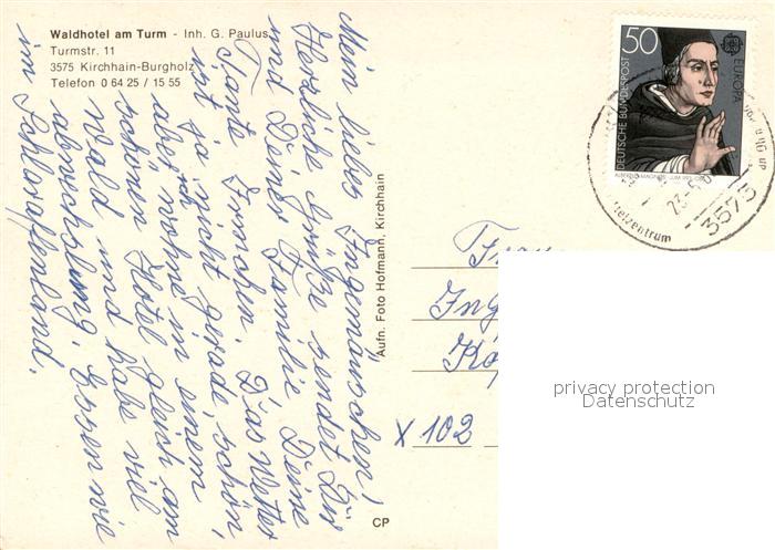 73723389 alte Postkarte Burgholz Kirchhain Waldhotel am Turm Wildgehege Aussichtsturm postalisch gelaufen Erhaltung siehe scans [FriedD77] KatCode: 11110006534011