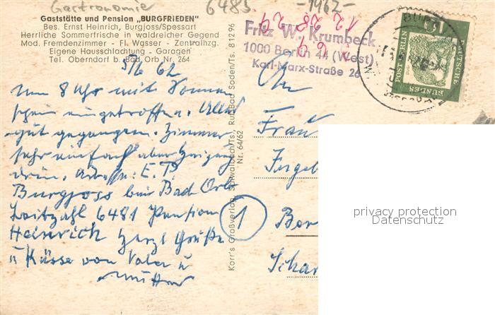 73706743 alte Postkarte Burgjoss Gesamtansicht und Gaststaeaete Burgfrieden postalisch gelaufen Erhaltung siehe scans [LiesaD40] KatCode: 11110006435016