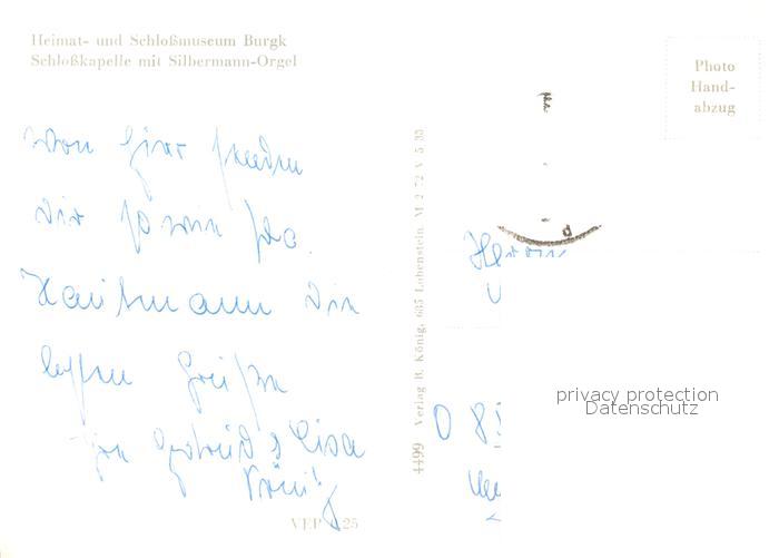 73139601 alte Postkarte Burgk Saale-Orla-Kreis Heimat- und Schlossmuseum Schlosskapelle mit Silbermann Orgel Handabzug postalisch gelaufen Erhaltung siehe scans [FriedD77] KatCode: 11110016075009