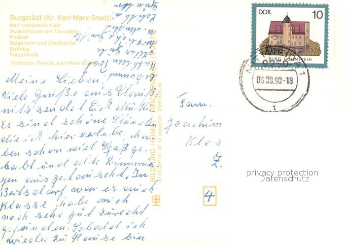 73654433 alte Postkarte Burgstaedt Sachsen Karl Liebknecht Hain Aussichtsturm am Taurastein Freibad Saigerturm und Stadtkirche Rathaus Frauenklinik postalisch gelaufen Erhaltung siehe scans [WerneD78] KatCode: 11110014182060