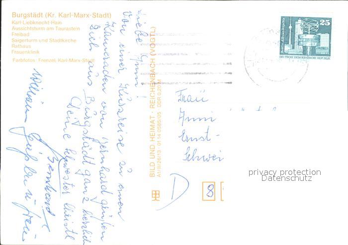 72261741 alte Postkarte Burgstaedt Sachsen Karl Liebknecht Hain Aussichtsturm Taurastein Freibad Saigerturm Kirche Rathaus Klinik postalisch gelaufen Erhaltung siehe scans KatCode: 11110014182060