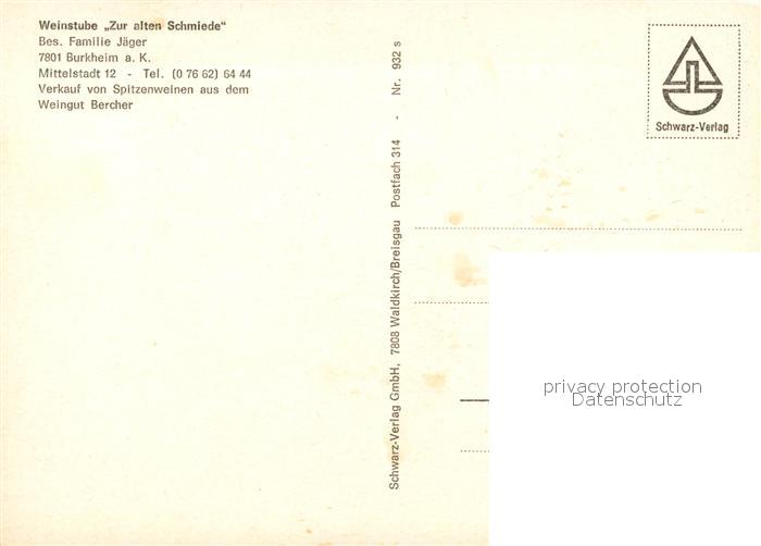 73087785 Burkheim Kaiserstuhl Weinstube Zur alten Schmiede postalisch nicht gelaufen Erhaltung siehe scans [KathaD81] KatCode: 11110008315133
