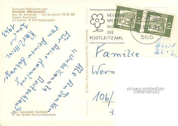 73642052 alte Postkarte Burscheid Terrassen Waldrestaurant Deutscher Maerchenwald postalisch gelaufen Erhaltung siehe scans [WerneD78] KatCode: 11110005378008