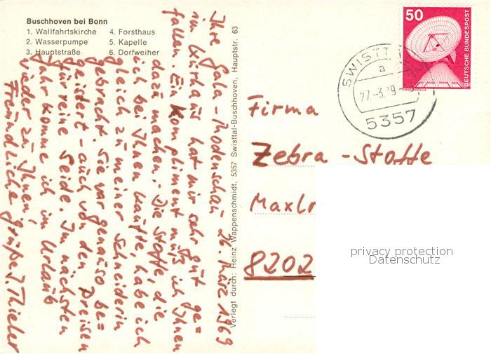 73801134 alte Postkarte Buschhoven Swisstal Wallfahrtskirche Wasserpumpe Hauptstrasse Forsthaus Kapelle Dorfweiher postalisch gelaufen Erhaltung siehe scans [WerneD78] KatCode: 11110005382064