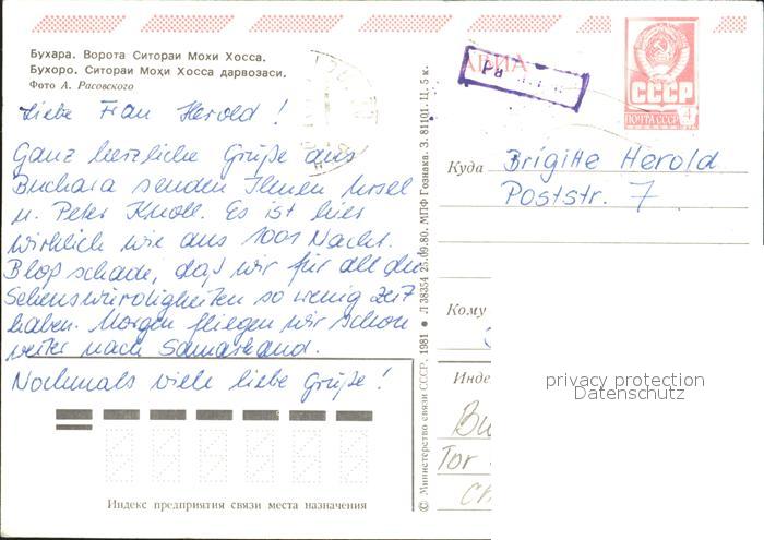 old postcard Buxoro Tor Sitorai Mocha Chossa postalisch gelaufen Erhaltung siehe scans