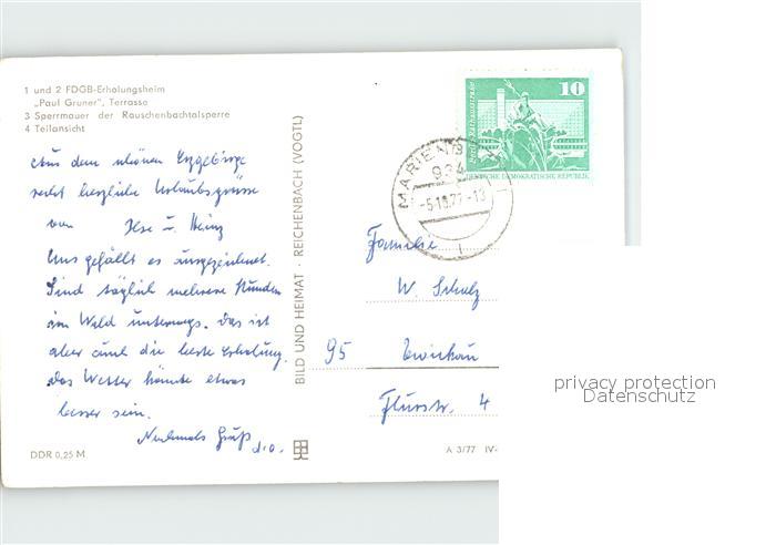 72383880 alte Postkarte Caemmerswalde FDGB- Erholungsheim Paul Gruner Sperrmauer der Rauschebachtalsperre postalisch gelaufen Erhaltung siehe scans KatCode: 11110014177300
