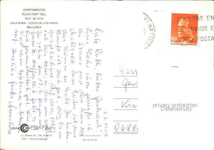 old postcard Cala Bona Apartamentos Playa Port Vell postalisch gelaufen Erhaltung siehe scans [LiesaD40 kt120box]