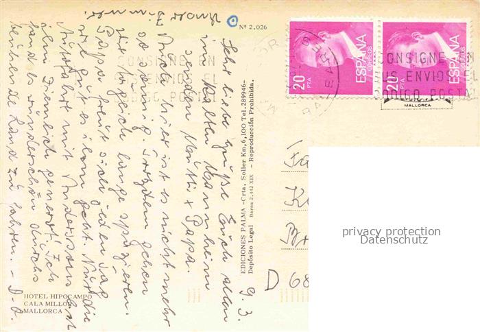 74086347 old postcard CALA MILLOR Mallorca ES Hotel Hipocampo postalisch gelaufen Erhaltung siehe scans [WerneD78] KatCode: 11510