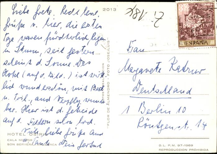 old postcard Cala Millor Mallorca Hotel Osiris postalisch gelaufen