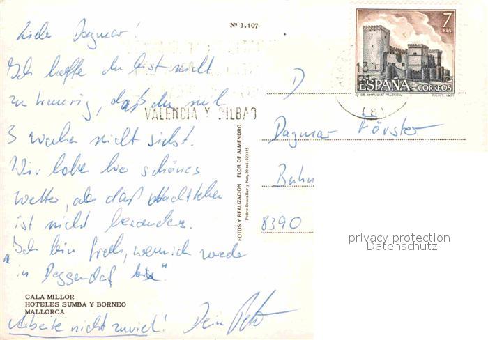 old postcard Cala Millor Mallorca Hoteles Sumba y Borneo Hotels Strand Mittelmeer Fliegeraufnahme postalisch gelaufen Erhaltung siehe scans [FriedD77]