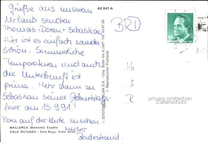 old postcard Cala Ratjada Mallorca Cala Guga Fliegeraufnahme postalisch gelaufen Erhaltung siehe scans