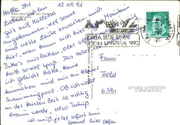 old postcard Cala Ratjada Mallorca Vista nocturna del puerto Hafen Nachtaufnahme postalisch gelaufen Erhaltung siehe scans