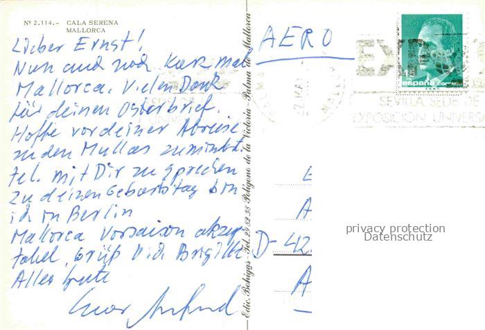 74124921 old postcard Cala Serena Cala d Or Mallorca ES Fliegeraufnahme postalisch gelaufen Erhaltung siehe scans [WerneD78] KatCode: 11510