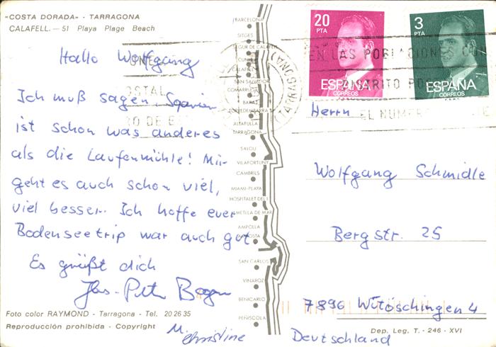 old postcard Calafell Strand Hotels postalisch gelaufen Erhaltung siehe scans