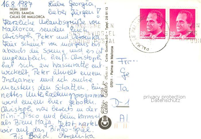 old postcard Calas de Mallorca ES Hotel Samoa Strand postalisch gelaufen Erhaltung siehe scans [FriedD77]