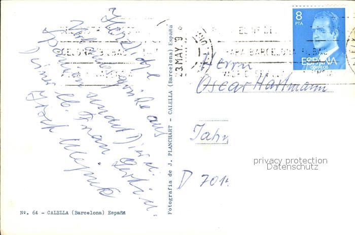 old postcard Calella Kueste Kirche Strand Promenade Palmen postalisch gelaufen Erhaltung siehe scans