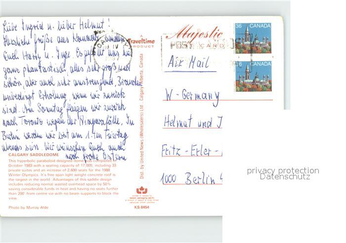 old postcard Calgary Saddledome bei Nacht postalisch gelaufen Erhaltung siehe scans