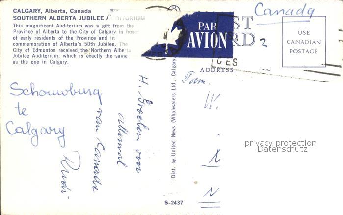 old postcard Calgary Southern Alberta Jubilee Auditorium postalisch gelaufen Erhaltung siehe scans
