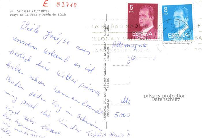 74006220 old postcard Calpe Calp Alicante ES Playa de la Fosa y Penon de Ifach postalisch gelaufen Erhaltung siehe scans [FriedD77] KatCode: 11510