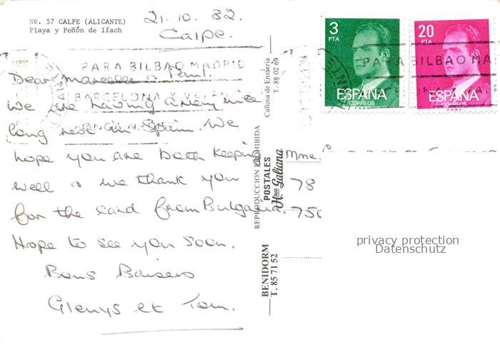74034274 old postcard Calpe Calp Alicante ES Playa y Penón de Ifach postalisch gelaufen Erhaltung siehe scans [FriedD77] KatCode: 11510