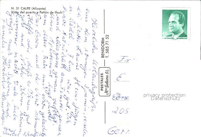 old postcard Calpe Vista del puerto y Penon de Ifach Fischerboote postalisch gelaufen Erhaltung siehe scans