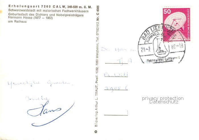 72655090 alte Postkarte Calw Fachwerkhaeuser Geburtshaus von Hermann Hesse Rathaus postalisch gelaufen Erhaltung siehe scans [LiesaD40] KatCode: 11110008235085