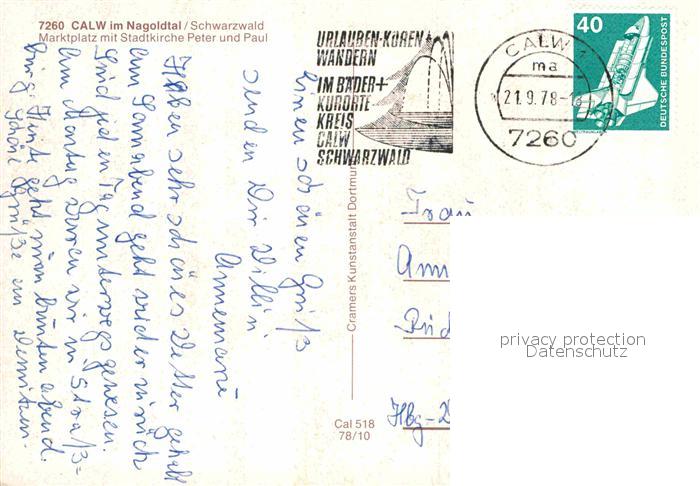 72706151 alte Postkarte Calw Marktplatz mit Stadtkirche Peter und Paul postalisch gelaufen Erhaltung siehe scans [WerneD78] KatCode: 11110008235085