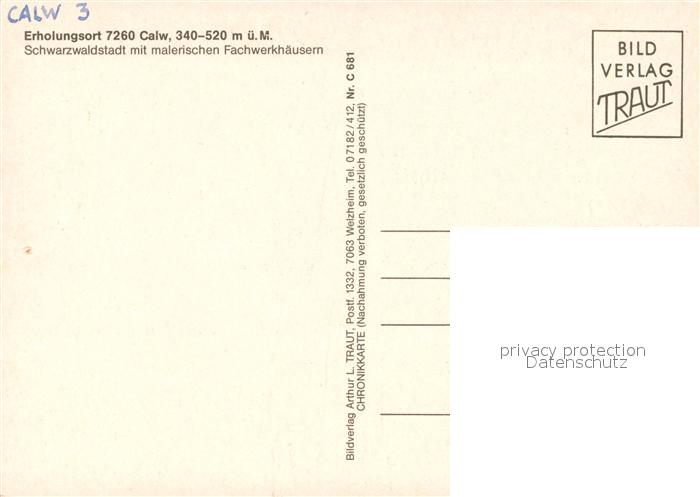 73182518 Calw Schwarzwaldstadt mit malerischen Fachwerkhaeusern Marktplatz Rathaus Kapelle Brunnen Chronik Wappen postalisch nicht gelaufen Erhaltung siehe scans [FriedD77] KatCode: 11110008235085