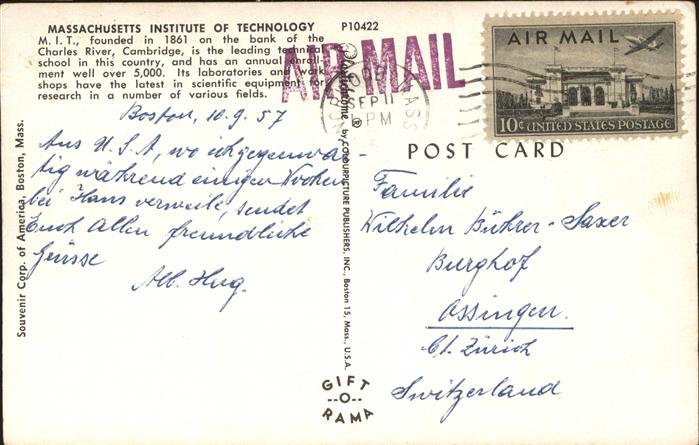 11491309 old postcard Cambridge Massachusetts Massachusetts Institute of Technology Charles River aerial view postalisch gelaufen Erhaltung siehe scans KatCode: 14140230000000