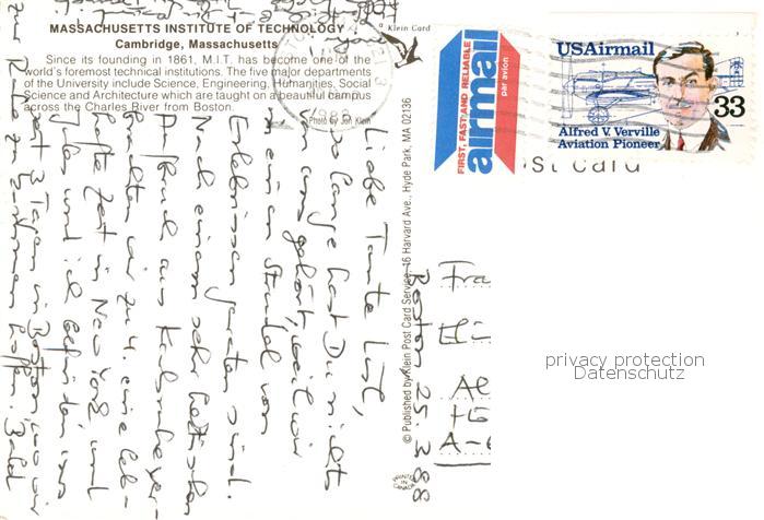 73848982 old postcard Cambridge Massachusetts USA Massachusetts Institut of Technology postalisch gelaufen Erhaltung siehe scans [WerneD78] KatCode: 14140230000000