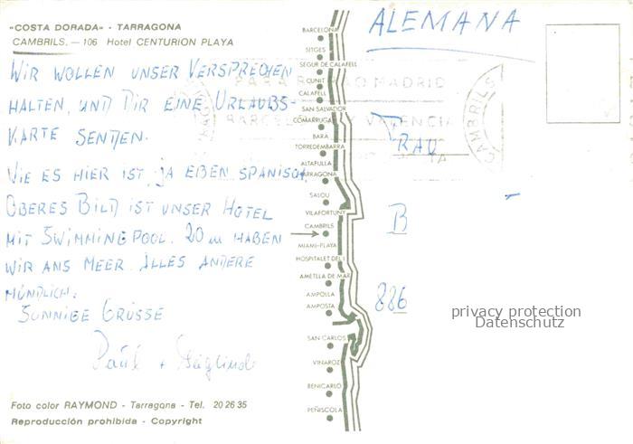 74148749 old postcard Cambrils Costa Dorada Tarragona ES Hotel Centurion Playa postalisch gelaufen Fliegeraufnahme Erhaltung siehe scans [FriedD77] KatCode: 11510