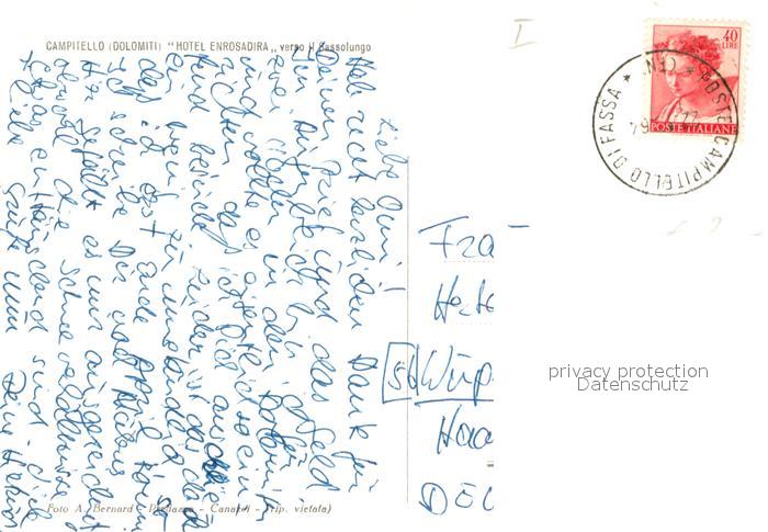 13631119 Campitello Fassa Sporthotel Enrosadira Dolomiten postalisch gelaufen Erhaltung siehe scans [FriedD77] old postcard Frie Katcode 11240