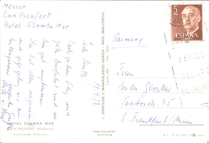 old postcard Can Picafort Mallorca Hotel Clumba Mar Piscina postalisch gelaufen Erhaltung siehe scans
