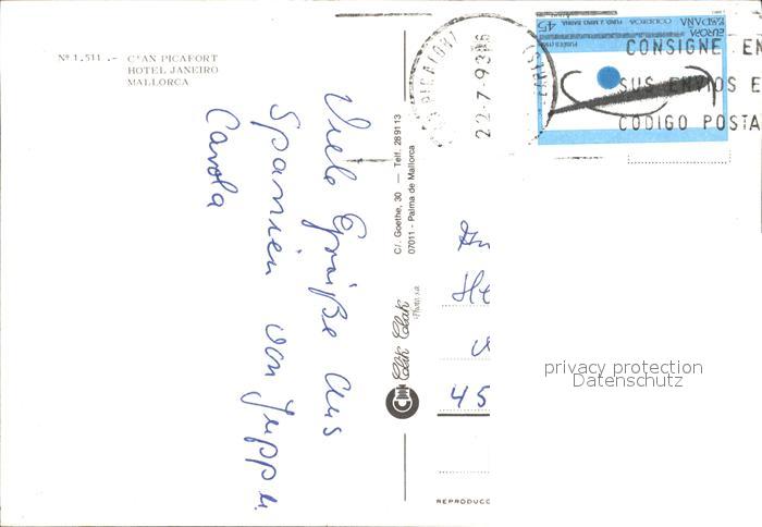 old postcard Can Picafort Mallorca Hotel Janeiro postalisch gelaufen Erhaltung siehe scans