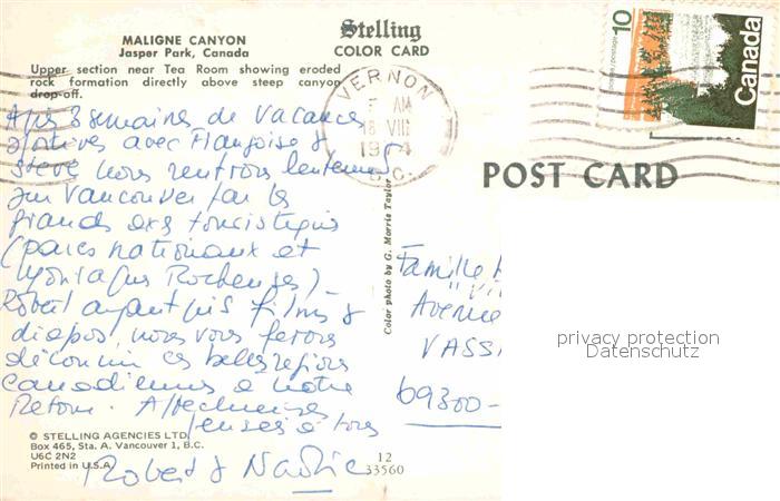 old postcard Canada State Maligne Canyon Jasper Park postalisch gelaufen Erhaltung siehe scans [LiesaD40]