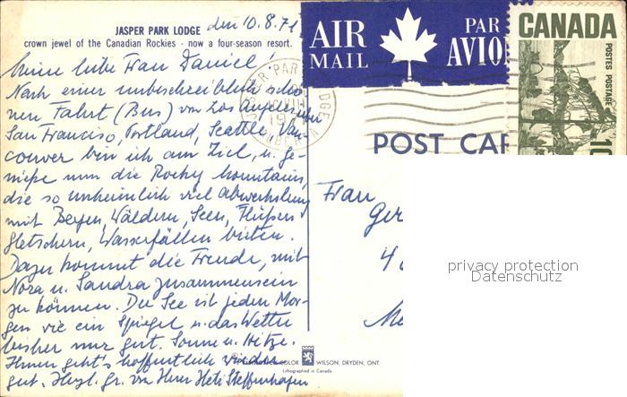 old postcard Canadian Rockies Jasper Park Lodge postalisch gelaufen Erhaltung siehe scans