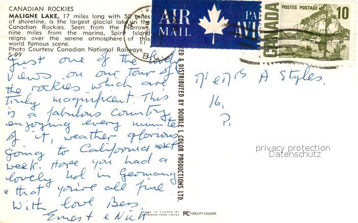 old postcard Canadian Rockies Maligne Lake postalisch gelaufen Erhaltung siehe scans [WerneD78]