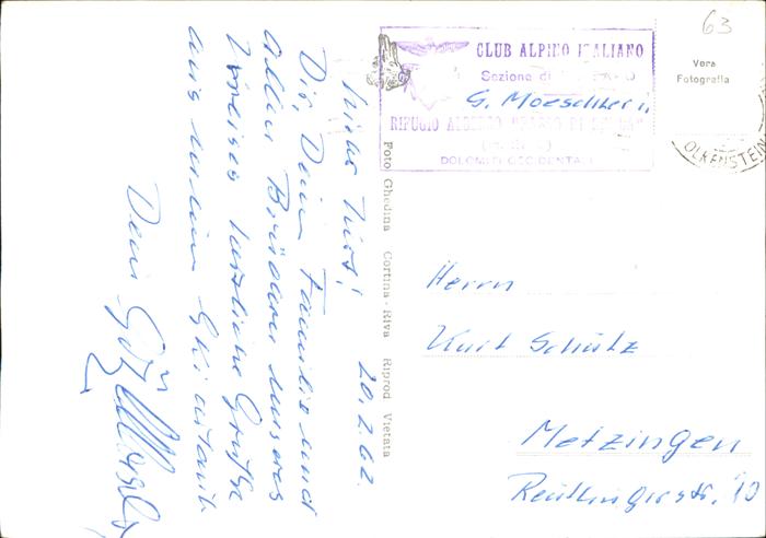old postcard Canazei Rifugio Passo Sella Sassolungo Dolomiti Sellajoch Berghuette Langkofel Gruppe Dolomiten postalisch gelaufen Erhaltung siehe scans