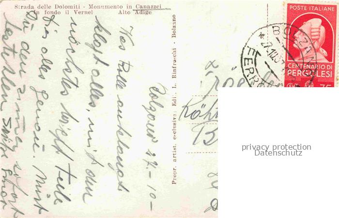74122108 old postcard Canazzei Monumento BOLZANO Bozen Suedtirol IT Strada delle Dolomiti Monumento in fondo il Vernel postalisch gelaufen Erhaltung siehe scans [FriedD77] KatCode: 11240