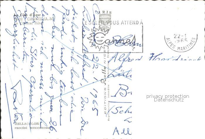 12032036 carte postale Cannes Alpes-Maritimes Carlton Hotel Segelboot Strand postalisch gelaufen Erhaltung siehe scans KatCode: 11170006106029