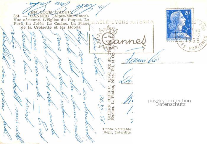12756318 carte postale Cannes Alpes-Maritimes Eglise du Suquet Port Jetee Casino Plage de la Croisette Hotels vue aerienne postalisch gelaufen Erhaltung siehe scans [FriedD77] KatCode: 11170006106029