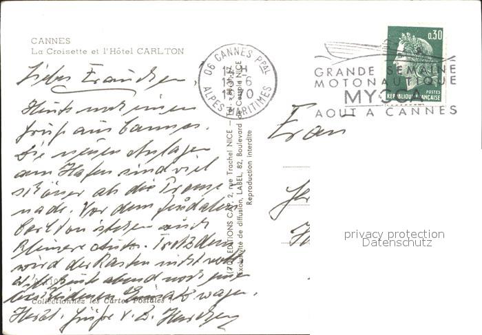12458988 carte postale Cannes Alpes-Maritimes Hotel Carlton postalisch gelaufen Erhaltung siehe scans KatCode: 11170006106029