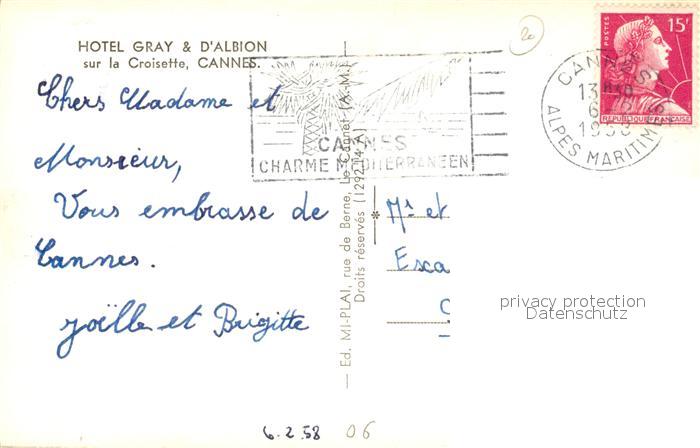 13493328 carte postale Cannes Alpes-Maritimes Hotel Gray et d Albion sur la Croisette Côte d’Azur postalisch gelaufen Erhaltung siehe scans [FriedD77] KatCode: 11170006106029