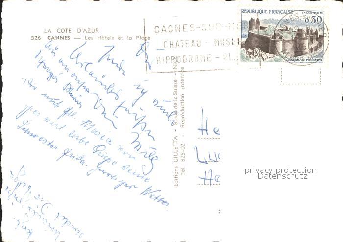 11903362 carte postale Cannes Alpes-Maritimes Les Hotels et la Plage Cote d Azur postalisch gelaufen Erhaltung siehe scans KatCode: 11170006106029