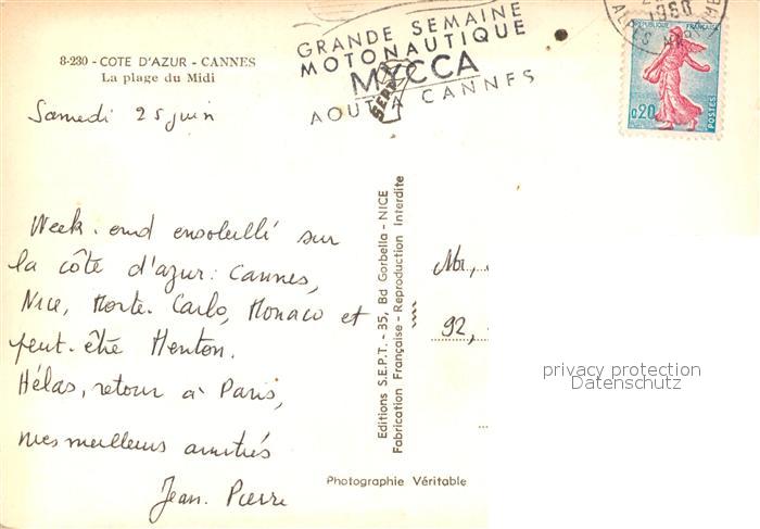 13580791 carte postale Cannes Alpes-Maritimes Plage du Midi Côte d Azur postalisch gelaufen Erhaltung siehe scans [FriedD77] KatCode: 11170006106029